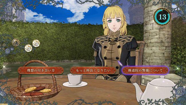 Puede invitar a un personaje a tomar té juntos, ya sea preguntándole manualmente durante el Paseo del domingo (esto consume indicador de actividad) o cuando es el cumpleaños del personaje en particular. Después de seleccionar las hojas de té adecuadas para usar, hay un mini-juego donde debes elegir el tema correcto dentro del límite de tiempo. Elegir el tema correcto mejorará los niveles de soporte entre usted y el personaje, pero las elecciones incorrectas no empeorarán los niveles de soporte.