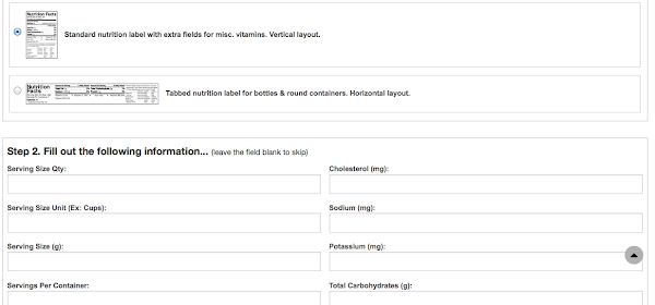 Sentí que hacer los valores nutricionales uno por uno era un poco pesadito así que busqué en google si existía algún sitio web que me permitiese hacerlo con solo llenar unos campos y ¡Zas! El primer resultado que arrojó la búsqueda fue http://www.onlinelabels.com/label-generator-tools/Nutrition-Label-Generator.aspx.