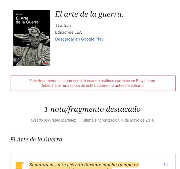 Nota muy Importante: Como se indica en rojo en el documento de ejemplo cada vez que añadas un marcador, crees una nueva nota o subrayes cualquier texto en un libro, el documento de Drive correspondiente a ese libro se borrará y se creará nuevo. De tal manera que se perderán todos los cambios que hayas realizado directamente en el documento. Para hacer cambios en el documento primero tienes que crear una copia del mismo, por desgracia esa copia no se actualizará si añades más notas desde el libro.