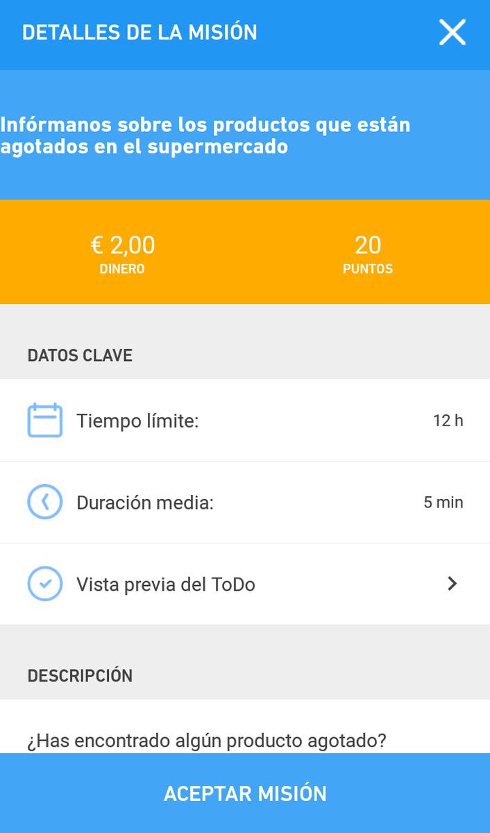 Posteriormente, existen dos tipos de misiones: las misiones “Donde quiera”, que se pueden hacer en cualquier lugar y en cualquier momento, y las “Misiones Cercanas” que se deben realizar en una ubicación específica. Estas misiones se pueden consultar en el mapa para ver cuáles están disponibles en cada momento. Reservas tu misión y la realizas. Cada misión puede pedirte diferentes tareas como comprobar los precios, ver si queda stock de algún producto, visitar puntos de venta, hacer fotos de la apariencia de alguna tienda o marca…