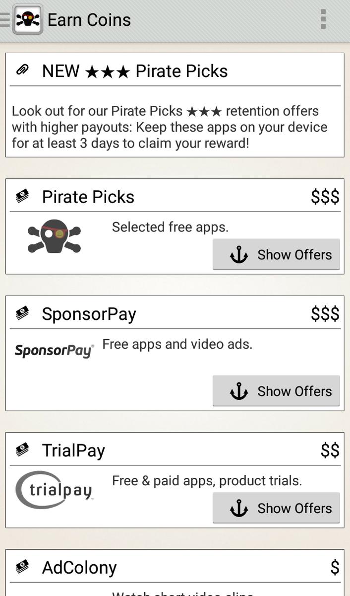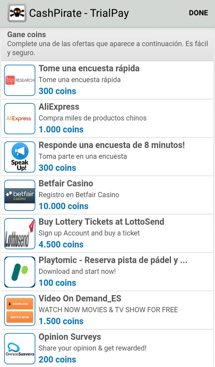 Cash Pirate es, sin duda, la más famosa App para ganar dinero. Lleva funcionando desde 2014 y sus usuarios están bastante satisfechos con ella. Tras descarga la App y registrarte, podrás ir acumulando ganancias con alguna de las siguientes acciones: descargar aplicaciones, probar juegos gratis, invitar a amigos, rellenar encuestas, probar productos y muestras, ver vídeos… Cada uno puede elegir la opción que más le gusta para ir acumulando dinero. Por cada invitado que se registre, tú ganarás el 10% de lo que ellos consigan.