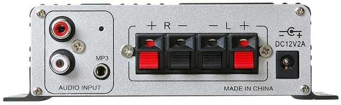 En la parte posterior se encuentran también dos juegos de entradas (sin salida de línea) para conectar los cables del altavoz y la fuente de alimentación de corriente continua (DC). El LP-2020A+ está clasificado para altavoces con una resistencia de 4 a 8 ohmios y puede emitir máximo 20 vatios RMS, pero Lapai no proporciona diferentes especificaciones para 4 y 8 ohmios.