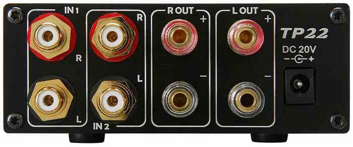 Tiene dos conjuntos de entradas para cable de altavoz o conectores de banana, para dos juegos de altavoces estéreo (con un selector A / B en el panel frontal), o para un bi-cableado con cable de 4 ohmios.