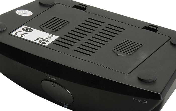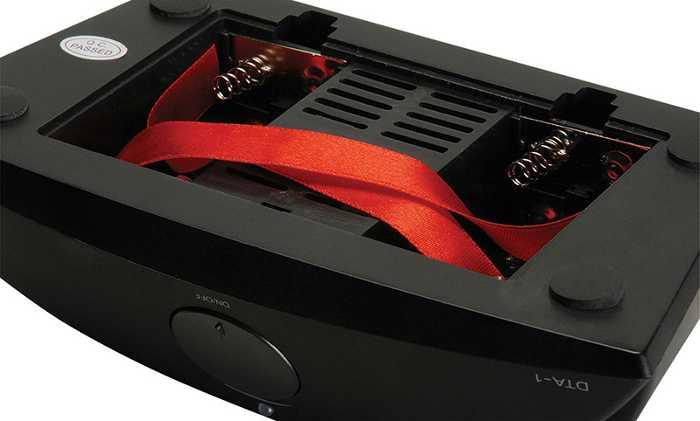 El DTA-1 también puede funcionar con 8 pilas AA, aunque no mantendrá los mismos niveles de volumen que cuando está enchufado. Viene en una caja con un manual de usuario de inicio rápido, un pequeño cable macho – macho de 3,5 mm, fuente de alimentación y varios convertidores para diferentes tipos de enchufe.