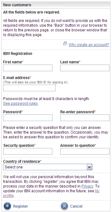 Terminarás en la página de inicio de sesión. En el lado derecho encontrará el registro para nuevos clientes. Por favor, rellene todos los campos aquí. El campo "Dirección de correo electrónico" será su futuro ID de cliente de IBM con el que podrá iniciar sesión en el portal. Una vez rellenados todos los campos, haga clic en el botón "Registrarse" que aparece a continuación.