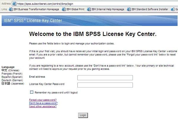 El registro se realiza con la dirección de correo electrónico del Contacto Principal o del Contacto Técnico. La contraseña es diferente a la que se utiliza en el lado del megafonía y debe solicitarse a través del botón "Olvidó su contraseña". Puede obtener soporte para el Centro de claves de licencia de SPSS enviando un correo electrónico a spss@subscribenet.com Si no puede encontrar su número de situación, el equipo de SPSS puede ayudarle.