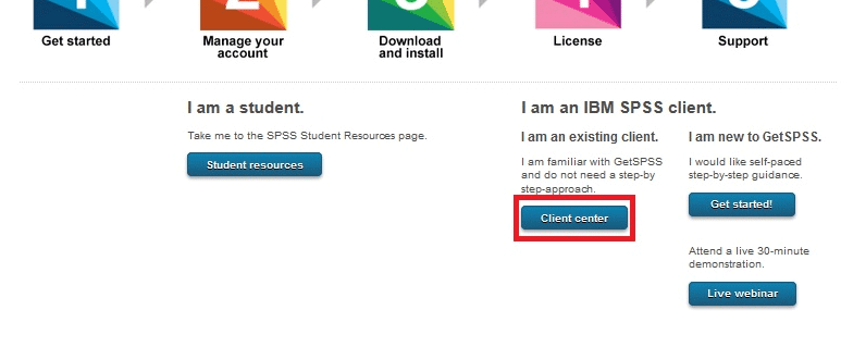El cliente registra el contacto principal en el sitio de IBM. (Puedes aquí descargar spss siguiendo las instrucciones: https://descargarspss.net)