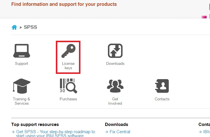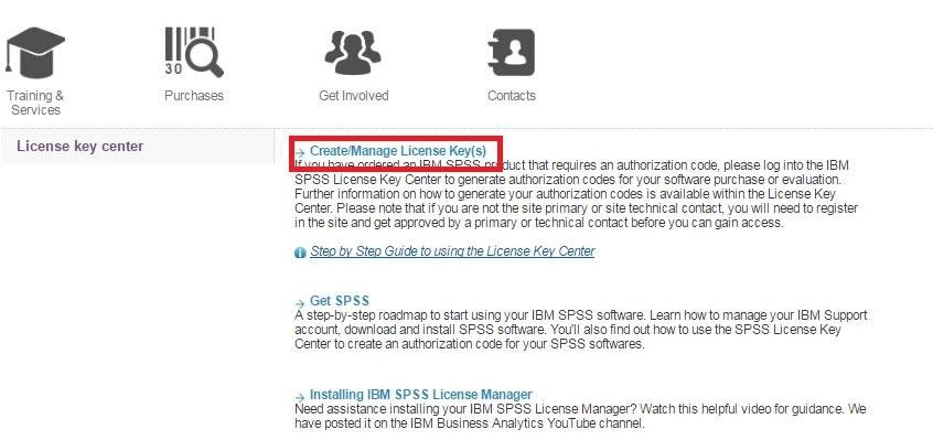 El software de estadísticas de IBM SPSS tiene su propio Centro de claves de licencia, donde puede obtener las claves de licencia para activar el software. El inicio de sesión se encuentra en IBM SPSS Business Analytics Client Center:Aquí encontrará el submenú Claves de licencia: