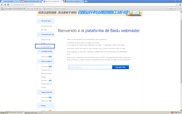 Página principal de las herramientas de webmaster Baidu13) Inicialmente, vamos a "añadir el sitio" a Baidu. Si bien con esta opción no estamos aún dando de alta "de verdad" nuestra página, si es el salto inicial mínimo para tener presencia en el buscador. Pulsa la opción que te he marcado en el pantallazo inferior "Enviar la URL".