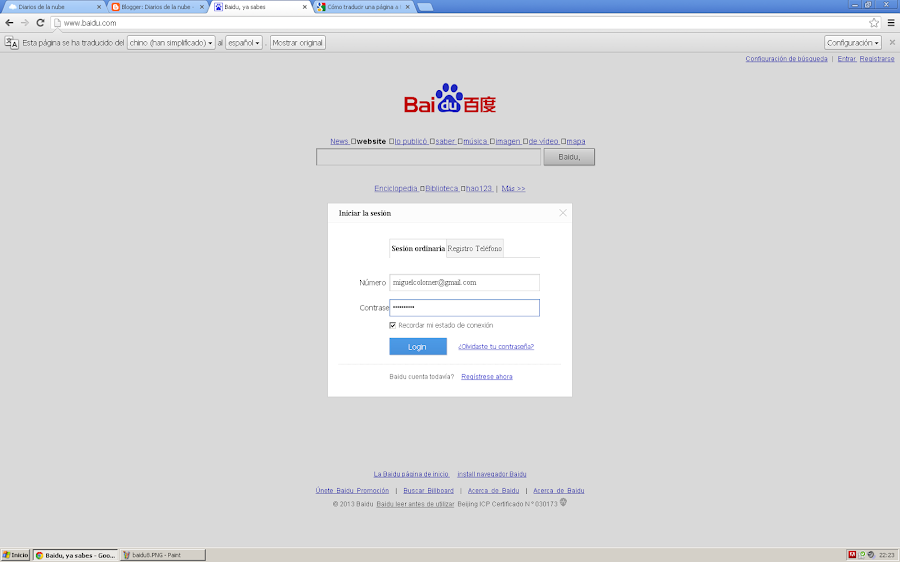 3) En el buscador Baidu, fíjate en el tercer enlace superior derecho que te he marcado en la pantalla inferior, "Registrarse":