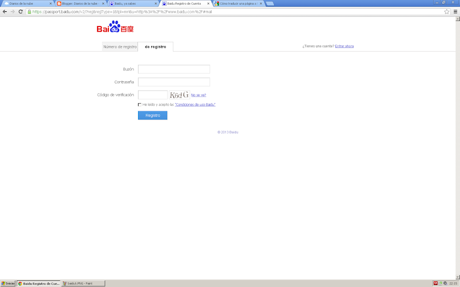 5) Introduce una dirección de correo de contacto donde Baidu se comunicará contigo para la activación de la cuenta de usuario o informaciones del buscador. Introduce la clave que piensas utilizar para tu usuario. Introduce el código de verificación para comprobación contra robots. Una vez leídas las condiciones de uso pulsa "Registrar".
