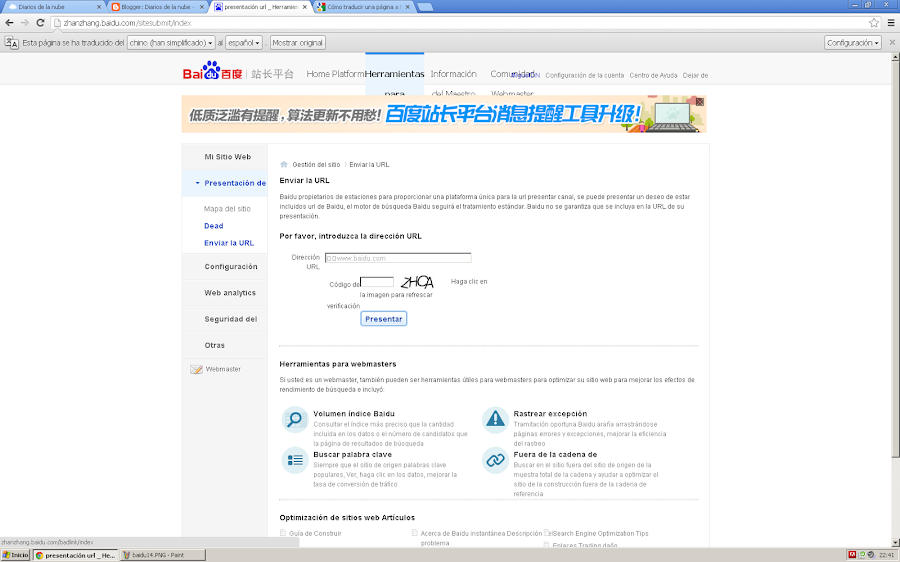 Para seguir los pasos utiliza Google Chrome pues va a ser necesario utilizar su tecnología de traducción para poder utilizar las herramientas de webmaster sin saber chino.