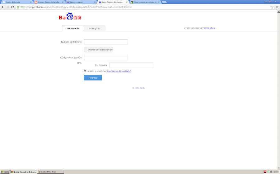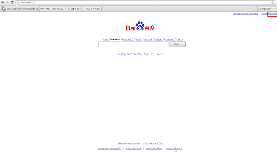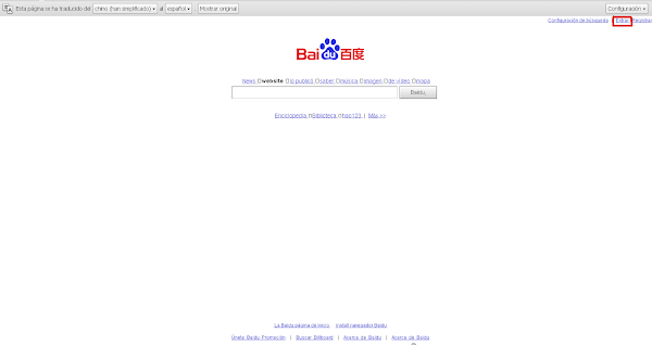 3) En el buscador Baidu, fíjate en el tercer enlace superior derecho que te he marcado en la pantalla inferior, "Registrarse":