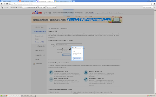 Presenta tu URL a BaiduSi todo ha ido bien, te indicará un pequeño mensaje afirmando "URL presentación fue un éxito".