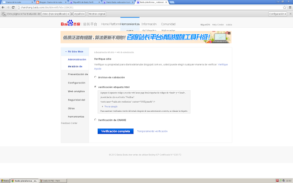 En tu Blog con domino no blogspot o en tu sitio web, debes escribir en la página principal, dentro del <head> (el código que está entre las etiquetas <head> y </head>) la "meta-etiqueta" que Baidu te muestre en pantalla. Algo así como: