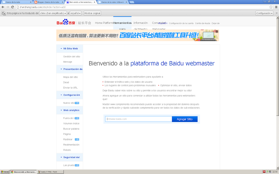 12) Accederás a la pantalla principal de las herramientas de webmaster de Baidu. No pulses "Agregar sitio" por el momento.