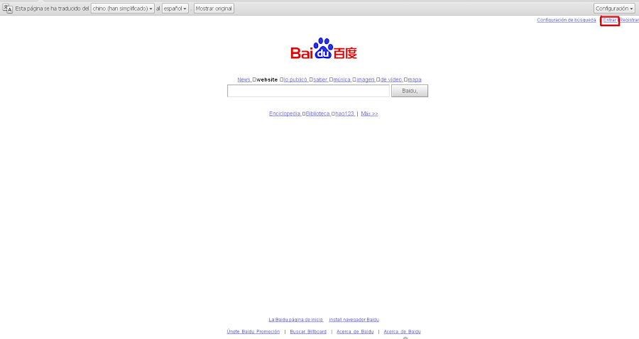 7) Si accedes, siempre que entres a Baidu, el segundo enlace de la parte superior derecha sirve para "Entrar". Te muestro en la pantalla inferior su localización.