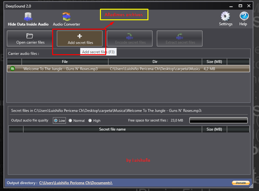 Una vez descargado el programa e instalado lo ejecutamos. Lo primero que veremos será la pantalla principal del programa, donde podremos ver un explorador de archivos con la raíz de nuestro disco duro. Aquí lo primero que debemos hacer es buscar la carpeta donde tenemos las canciones “portadoras”, es decir, en las que queremos ocultar los archivos.