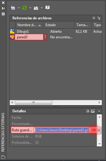 Pulsamos sobre la imagen que desapareció, en nuestro caso PARED3, ahora en la parte inferior de la ventana DETALLES buscamos la opción RUTA GUARDADA, abrimos lateralmente la ventana y seleccionamos el texto de la ruta, ahora pulsamos sobre el botón de los tres puntitos.