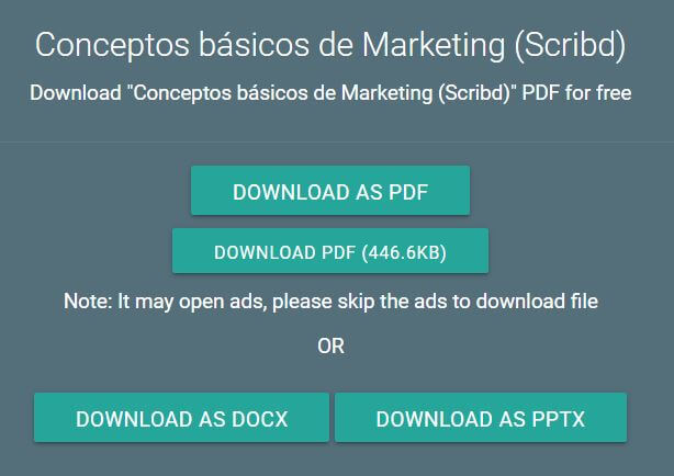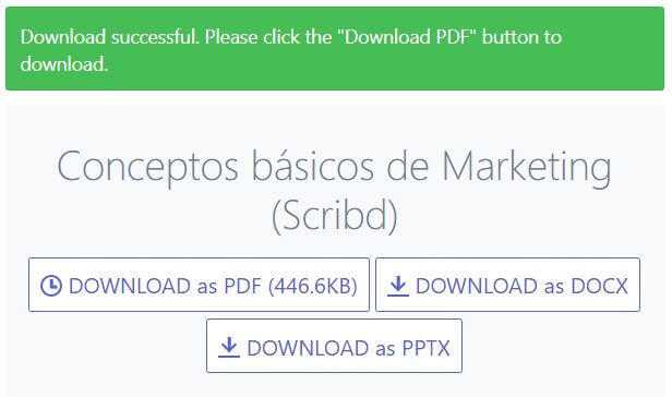 Finalmente te aparecerá el siguiente cuadro en el cual ya podrás bajar tu documento de scribd en pdf, docx o pptx de forma gratuita y sin tener que subir archivos o registrarte.