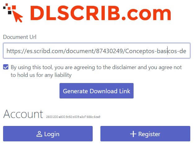 En DLSCRIB.com sólo necesitas copiar el link del archivo de scribd y pegarlo en la caja que dice "Document Url" (Input your document here).OJO: Debes marcar la casilla (check) que indica "By using this tool, you are agreeing to the disclaimer". Si no lo haces no se podrá generar tu link de descarga. Este es un paso que muchos usuarios omiten y por eso piensan que dlscrib no funciona y buscan otras alternativas.