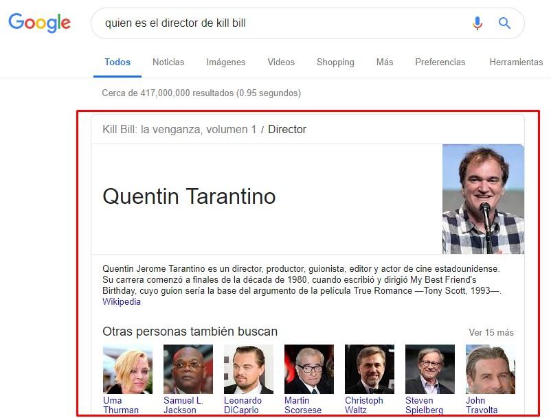 Desde la actualización Hummingbird, Google comenzó a devolver respuestas mucho más humanizadas y a entender búsquedas más complejas, aquí tienen un papel muy importante las búsquedas por voz. Por ejemplo: se dejaba de buscar “Quentin Tarantino” para empezar a buscar “Quién es el director de Kill Bill” a lo que Google responde con una rich card, sin necesidad de hacer clic en ningún resultado.