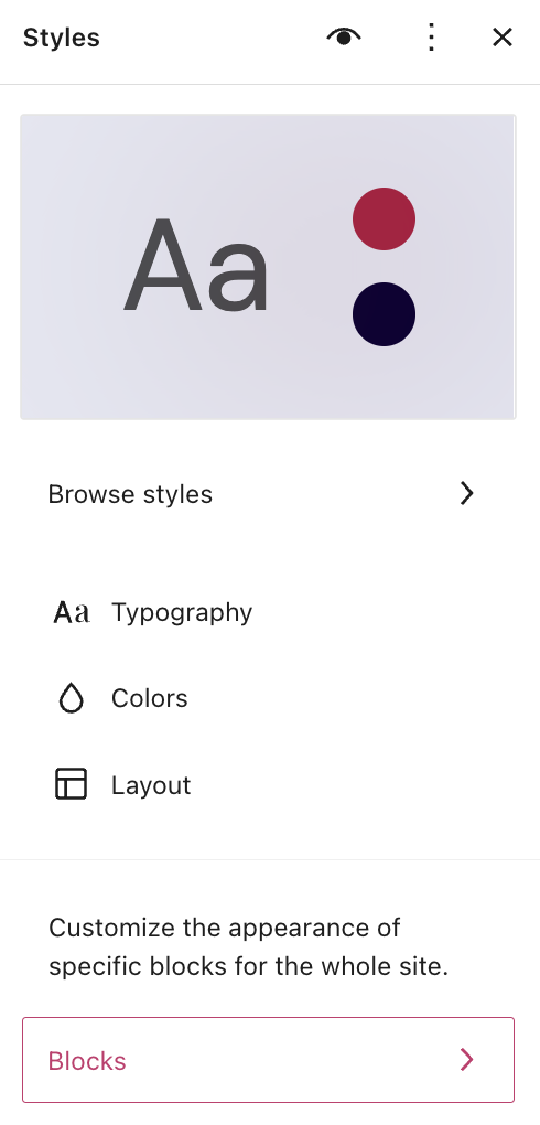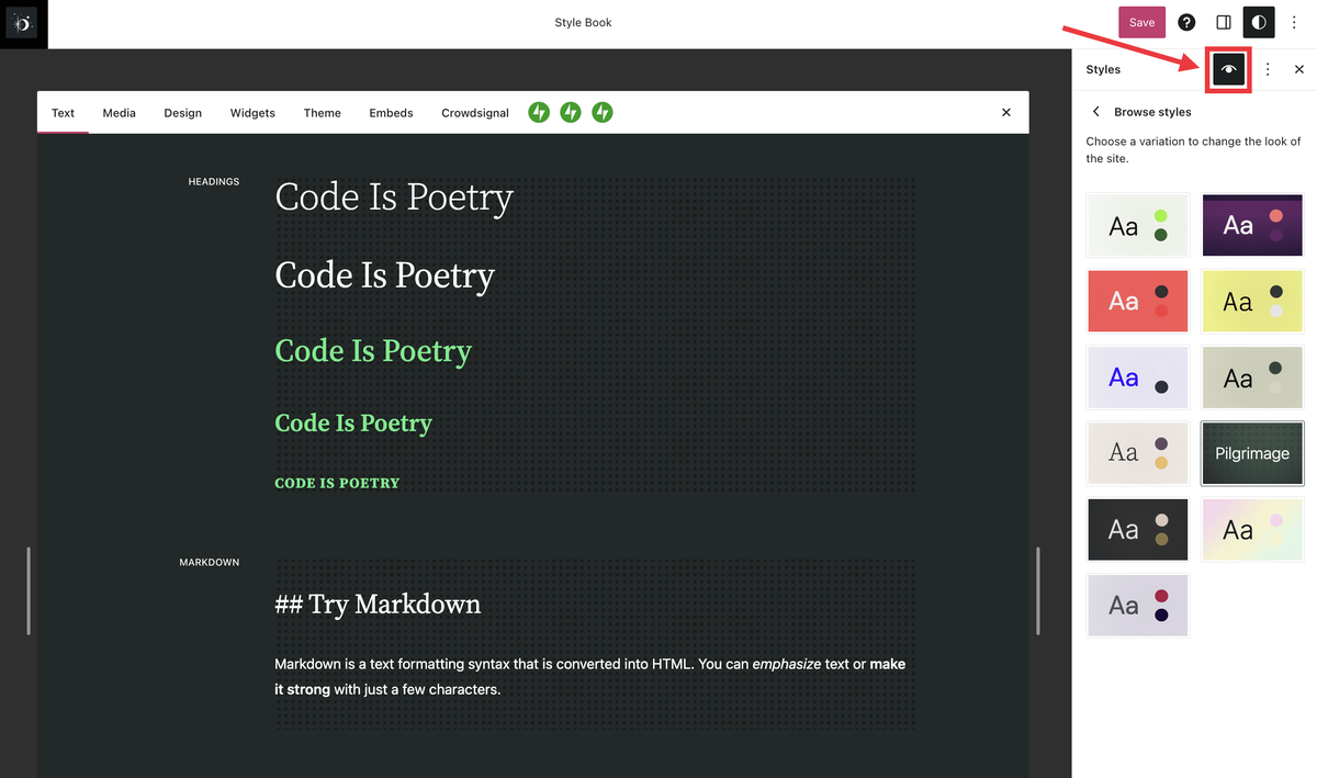 Desde el Editor del sitio (en la barra lateral izquierda, ve a Apariencia → Editor), haz clic en el botón Editar en la parte superior izquierda de la página y después en el icono de Estilos en la parte superior derecha. Aparecerá una barra lateral con varias opciones para explorar. (Nota: es posible que esta opción no aparezca si el tema que utilizas no es compatible con el Editor del sitio).El mejor lugar para empezar es el libro de estilos. Con el libro de estilos puedes echar un vistazo a los distintos esquemas de color y tipografía y hacerte una idea de cómo quedarán los diferentes bloques antes de insertarlos: