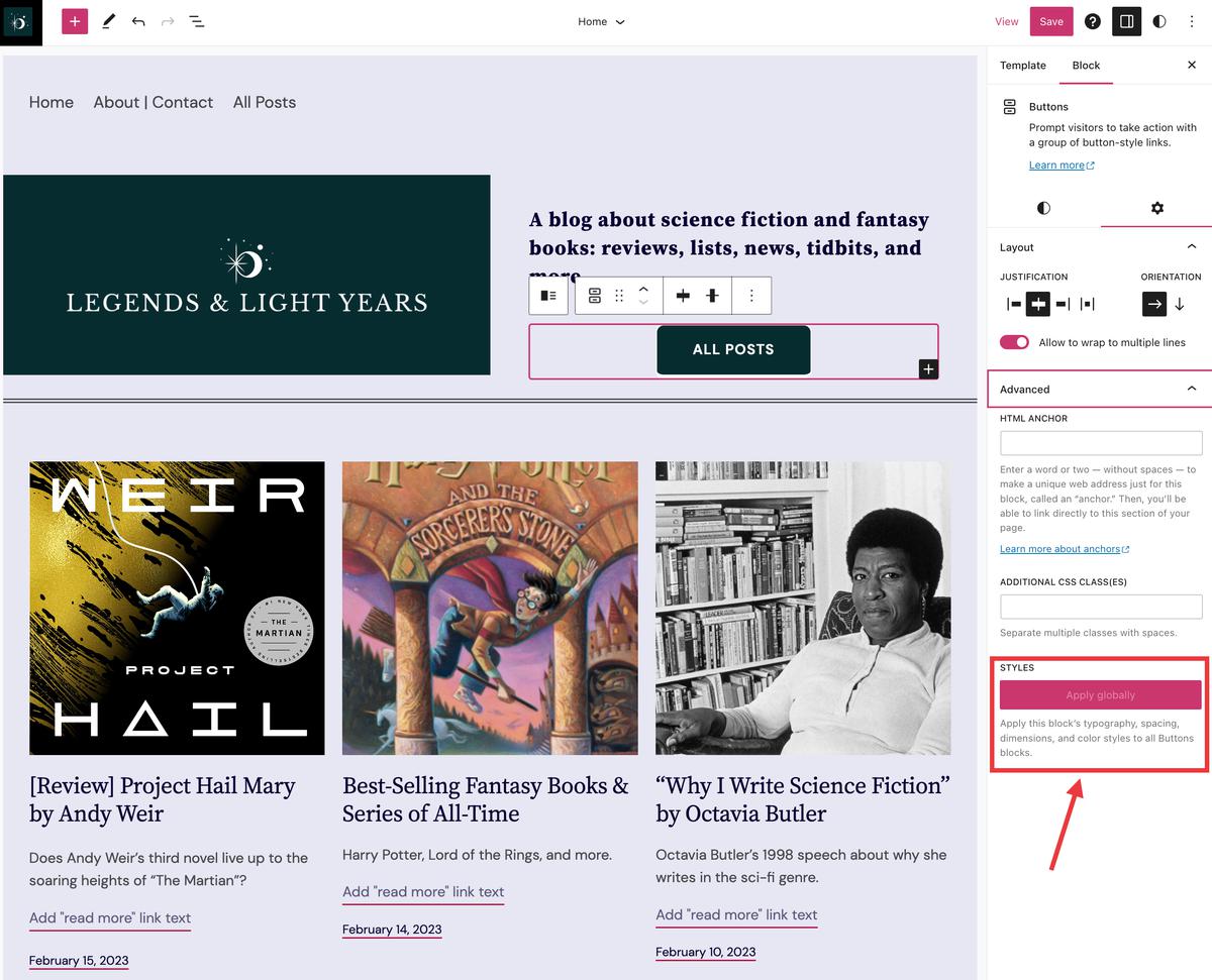 Cuando estableces un estilo específico para un bloque desde el Editor del sitio, los cambios que hagas en páginas o entradas concretas sólo se aplicarán a esa ubicación, aunque puedes darle el botón Aplicar globalmente para incorporarlos a todo el sitio.