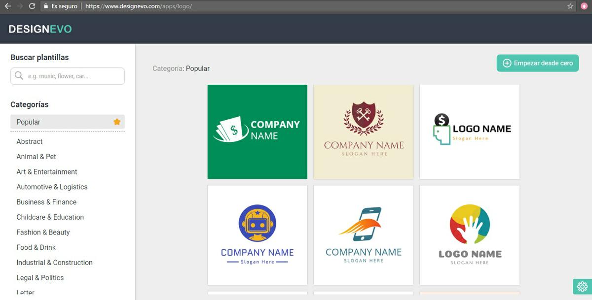 Afortunadamente puedes empezar a crear tu logotipo a partir de una plantilla predefinida, esto te ahorrará mucho tiempo pues el servicio presume de tener más de 4000 plantillas listas para escoger. Puedes incluso filtrar las plantillas por categorías y escoger la que más te guste. Inmediatamente después podrás introducir el nombre de la organización y algún eslogan para tener la mitad del trabajo hecho.