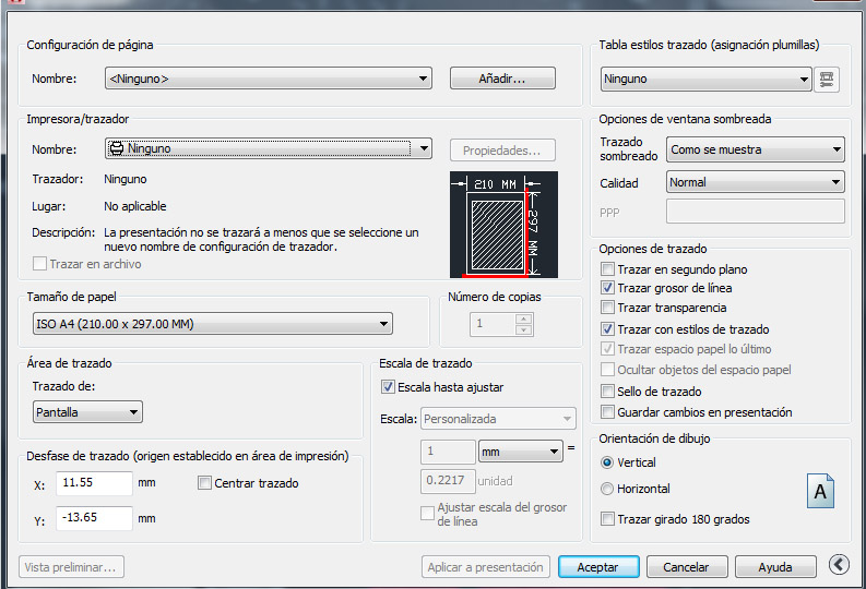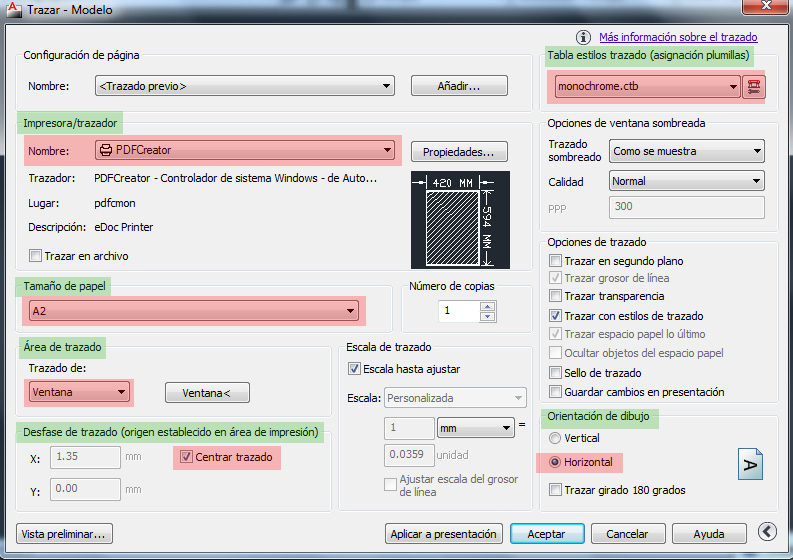 IMPRESORA/TRAZADOR: seleccionamos ADOBE-PDF, o la impresora pdf que tengáis instalada. Si no tenéis ninguna impresora pdf instalada, recomiendo el post que realizamos; Instalar impresora virtual PDF