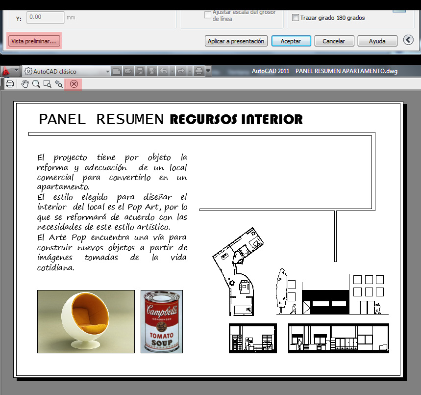 Para comprobar que la impresión está bien configurara pulsaremos en la pestaña inferior izquierda de la ventana TRAZAR ? MODELO y podemos ver la vista preliminar de nuestro panel resumen. Para cerrar esta vista preliminar pulsaremos sobre la CRUZ de la parte superior izquierda. Y pulsamos aceptar.