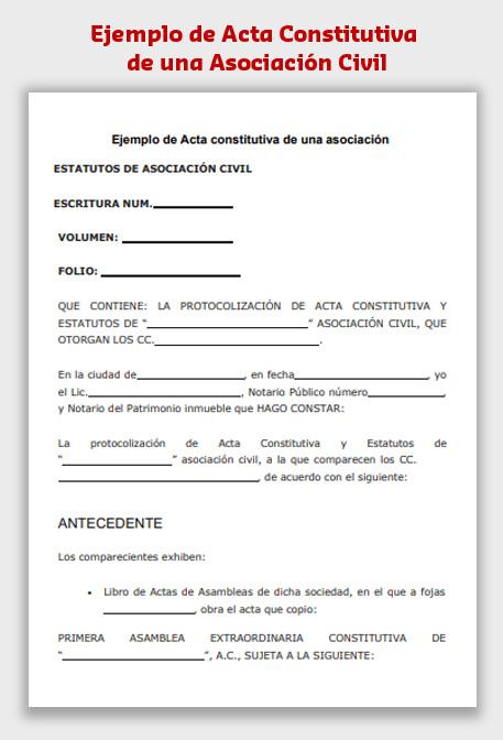 Puedes ver un ejemplo en el siguiente enlace:Descargar PDF Acta Constitutiva de una Asociación Civil