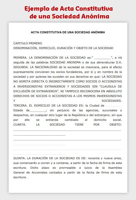 En el siguiente enlace podrás ver un ejemplo:Descargar PDF Acta Constitutiva de una Sociedad Anónima