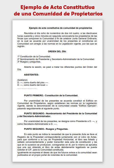 Ve un ejemplo en el enlace:Descargar PDF Acta Constitutiva de una Comunidad de Propietarios