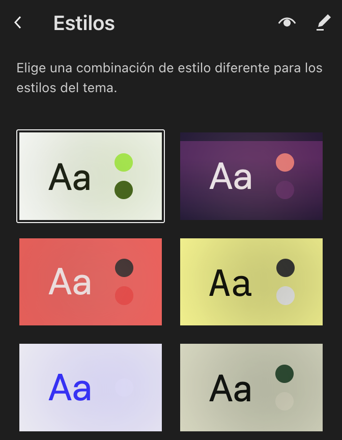 No solo se ha mejorado la gestión del contenido, también la edición del diseño. Ahora tenemos la sección Estilos en el editor del sitio, desde donde podrás experimentar con diferentes combinaciones de colores y tipografías (siempre que estén disponibles en tu tema). También podrás abrir el Libro de estilos para hacerte una idea de cómo quedarían algunos bloques con estilos diferentes.