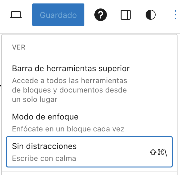 Puedes acceder al modo sin distracciones con el atajo de teclado Shift + Cmd + \ en Mac y Shift + Ctrl + \ en Windows, o desde el menú de tres puntos de la parte superior derecha.