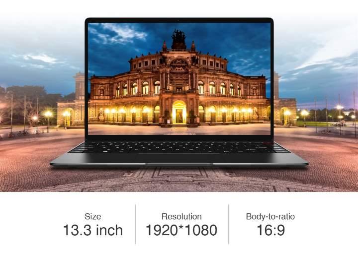 El portátil ligero de CHUWI monta una pantalla panorámica de 13.3 pulgadas, con una resolución Full HD en formato 16:9. Una de las características más destacables del Aerobook son sus finos marcos, de un grosor de solo 5mm en los bordes, entregando así un ratio de pantalla de más del 80%.