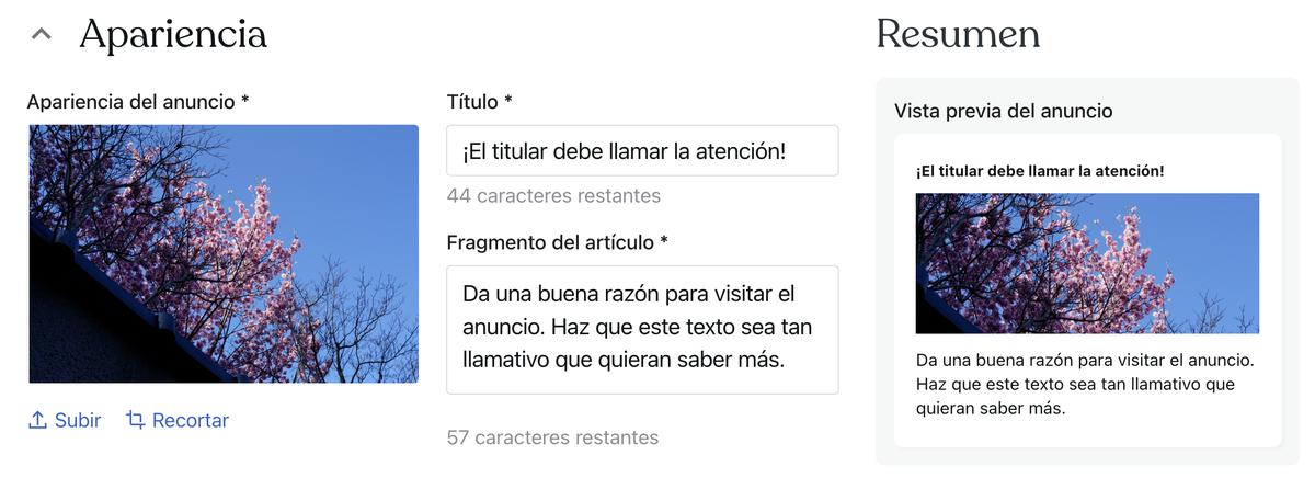 Blaze utiliza automáticamente el título de la entrada de blog como titular del anuncio. Pero puede que te interese crear uno nuevo y más llamativo específico para el anuncio. No es necesario que sea exactamente igual que el título de la entrada, solo tiene que atraer la atención e invitar a los lectores a descubrir más.Por ejemplo, si el título de la entrada de blog es 10 consejos para tu jardín, un titular más atractivo podría ser Transforma tu jardín con estos consejos.