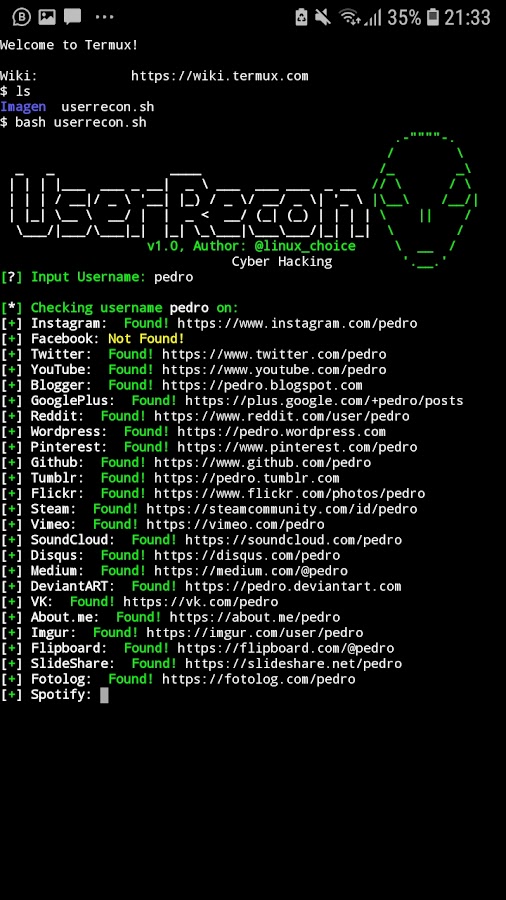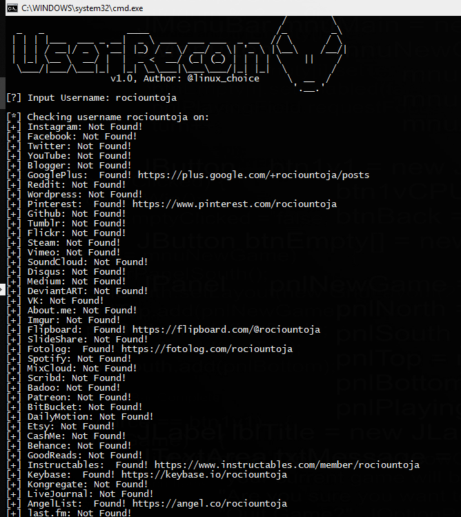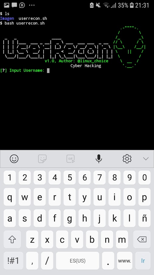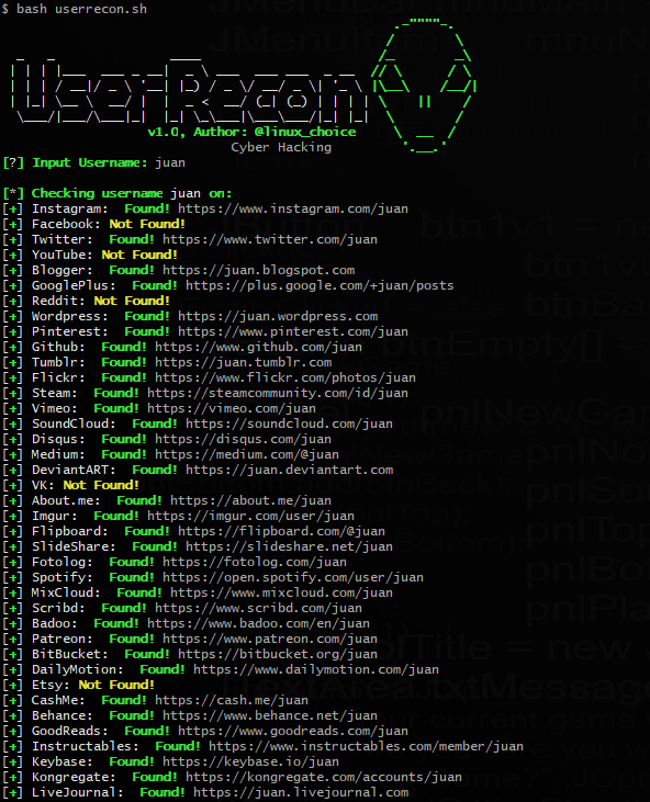 Después de ejecutar el script, obtendrá la página de bienvenida de UserRecon y le pedirá el nombre de usuario que desea revisar en la web.