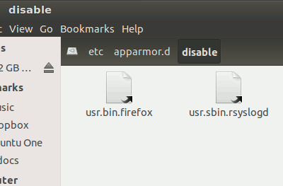Además de los perfiles que se ejecutan en el arranque, hay varios perfiles disponibles pero desactivados de forma predeterminada. Puede consultarlos en la carpeta «/etc/apparmor.d/disable». Desde aquí se puede ver que los perfiles de Firefox y Rsyslogd no están habilitados.