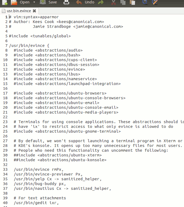 Aunque los Perfiles suenan como un módulo de software complicado, en realidad es un simple archivo de texto con rutas de archivo incluidas que indican a qué carpetas y directorios puede acceder la aplicación. Así es como se ve el perfil de eVince (puede hacer clic fácilmente en cualquier perfil en la carpeta «/etc/apparmor.d» para abrirlo en su editor de texto).
