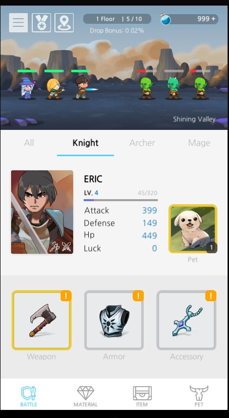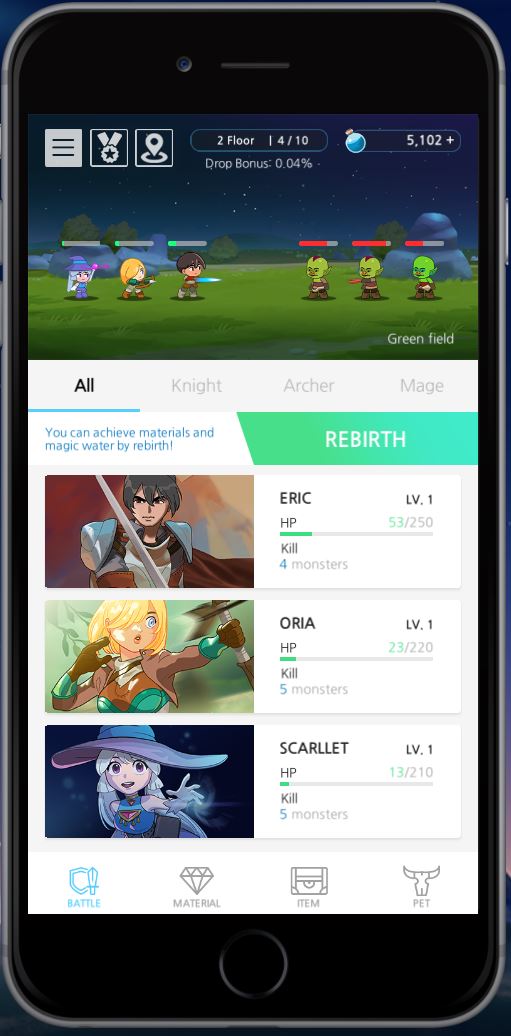 Los 3 héroes disponibles en el juego son: Eric (caballero), Oria (Arquera) y Scarllet (Maga) (podremos adquirir a los tres). Cada uno de ellos tiene distintos atributos (ataque, defensa y hp) y podremos subirlos de nivel a medida que avancemos en el juego.