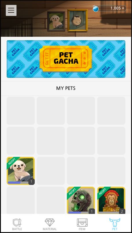 Además de los materiales, también tenemos la opción de adquirir mascotas. Actualmente las funciones de las mascotas son las mismas que las de los accesorios (subir nuestros atributos), aunque en un futuro cercano podremos enviarlas a recolectar materiales.