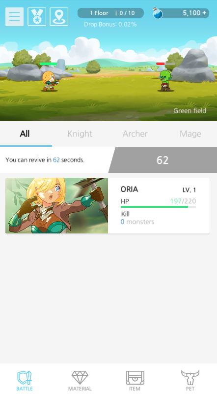 El combate es automático, con lo cual podremos tener el juego en un segundo plano mientras hacemos otras tareas. Una vez nuestros personajes mueran, tendremos que resucitarlos. No existe penalización por la muerte de nuestros personajes, pero se nos ofrece la posibilidad de "resucitarlos" antes de que mueran para recolectar ante las recompensas por el combate. En cualquier caso, recibiremos mejores materiales mientras más lejos lleguemos.