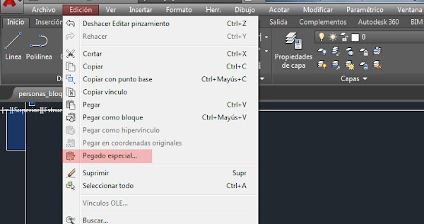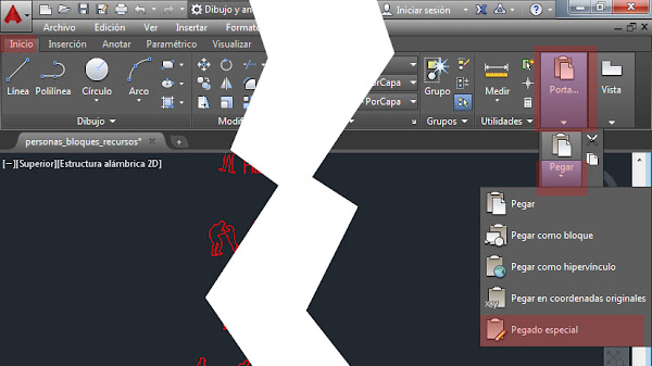 En Autocad pulsamos en INICIO – PORTAPAPELES en el desplegable seleccionamos PEGADO ESPECIAL.