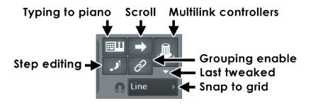 - Step editing: Se usa con el teclado virtual para introducir notas. Para ello debes pinchar en el botón "Pisada, (Step editing)" del Snap Panel y en el botón "manita" del Shortcut Panel 1