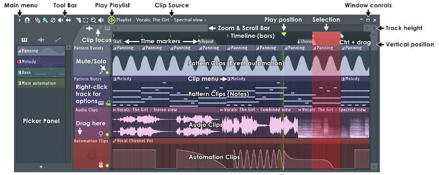 - Tracks (pistas). Deberás pinchar en cada Patrón del Picker Panel y pegarlo a cada Track con la Brocha. Te recomiendo que a cada track le pongas el mismo nombre, color e icono que ya pusiste en el Patrón. Puedes moverlos hacia arriba o hacia abajo para ordenarlos con ALT+flecha arriba o abajo.