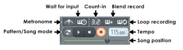 Los botones de Play, Stop y Record se usan cuando grabas el sonido que entra desde una fuente MIDI. Los dos primeros los puedes usar también en cualquier momento tanto en el Piano Roll, como en la Playlist