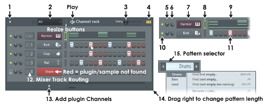 Por cada nuevo canal que introduzcas en el Channel Rack (ver más abajo) deberás crear un nuevo Patrón (Pattern) con el signo "+". que será en el que introducirás las notas en el Piano Roll. Después, en la Playlist verás que tendrás todos los patrones que has creado a tu izquierda y los podrás añadir a los canales del grid.