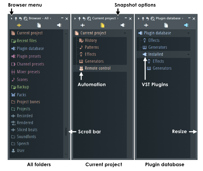 - En el Browser se encuentran todos los samples y generadores que trae Fl Studio de fábrica presentados en forma de árbol. También los Plugins externos que importo.
